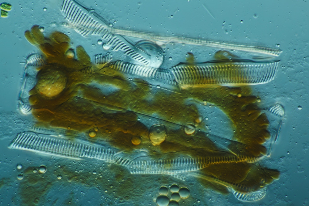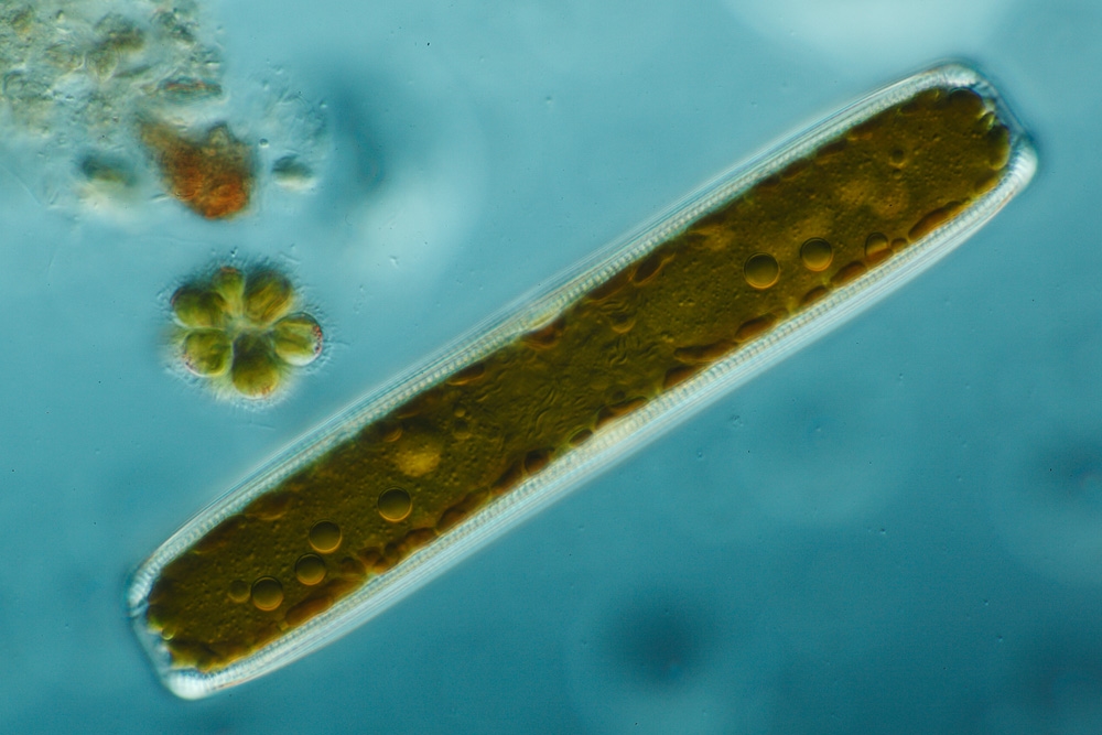 Eine Kieselalge (Pinnularia) mit einer Goldalge