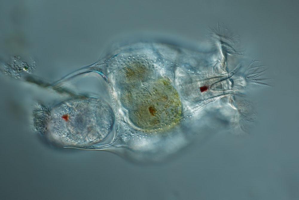 Ein Rädertierchen mit Ei (Brachionus quadridentatus?)
