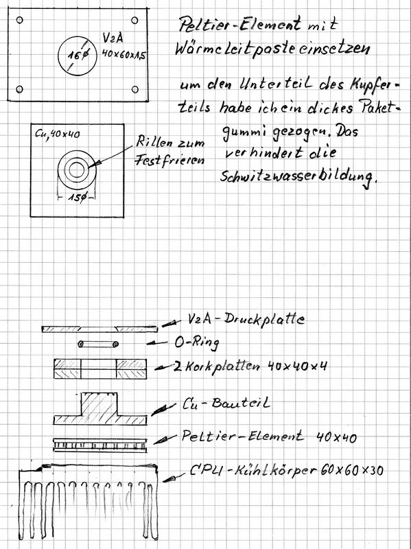 Unten sitzt das Gebläse, dann folgt das Peltierelement, eine weiße Gummplatte, ein Korkring und dann noch eine Aluminiumplatte V2A-Druckplatte mit einer Bohrung für den Kupferstempel. Der schwarze Gummiring um den Kupferstempel ist ein Schutz vor eindringendem Wasser. Der Kupferstempel steht auf dem Peltierelement; dazwischen befindet sich Wärmeleitpaste.