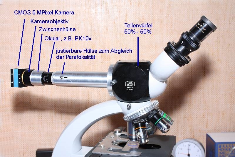 das habe ich (und andere) auch schon mit einem Monoschrägtubus oder wahlweise Geradtubus (weniger Glasflächen) so gemacht. Wird nur kritisch bei lichtverschluckenden Anwendungen (hohe Vergrößerungen/Pol etc.) wegen der 50%igen Lichtausbeute.