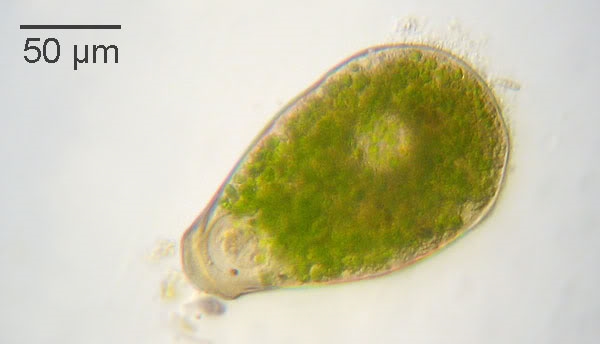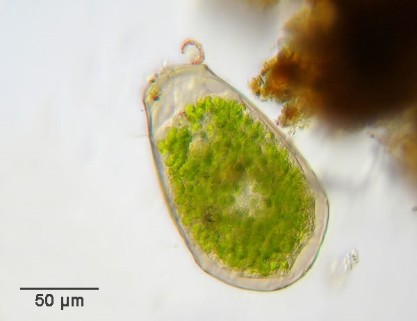 leider konnte ich außer dem Zellkern nichts weiter erkennen. Die Tiere, die ich fand, waren alle weitgehend vom Zytoplasma mit den Zoochlorellen ausgefüllt. Aber ich werde in jener Probe sicherlich noch mehr Exemplare finden.