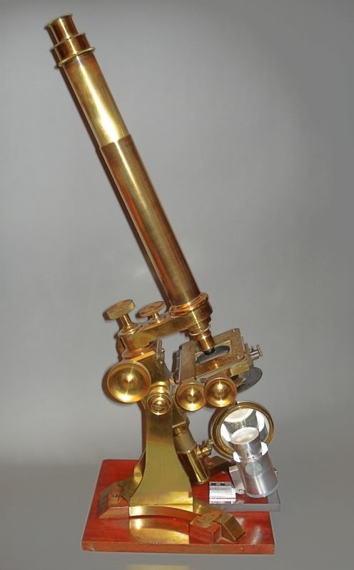 Nun muss man sich vielleicht vor Augen führen, dass es soo wahnsinnig viele Variationsmöglichkeiten in der Gestaltung eines schlichten Hufeisenstativs nun auch nicht gibt; Hufeisenfuß mit Scharnier, C-förmig gebogener Tubusträger, Fokussiertriebe oben, Tubusrohr in Schwalbe - fertig. Die kleinen Unterschiede machen dann den Reiz für viele Sammler aus!