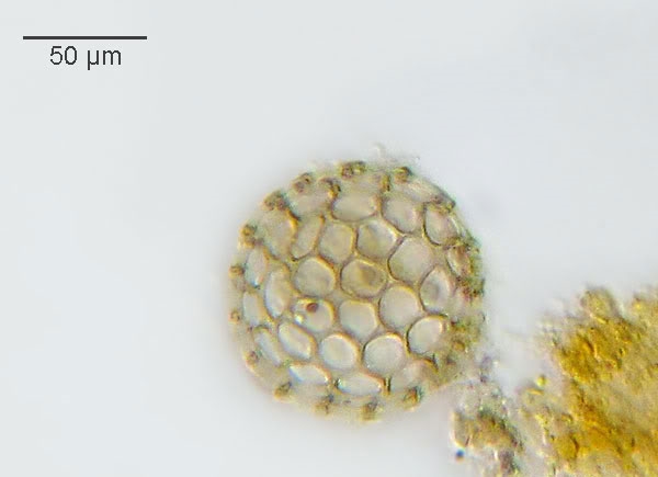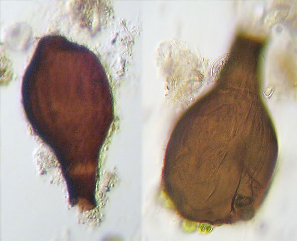 Die zweite (Das Bild zeigt verschiedene Exemplare) ist recht groß (um 170-180 µm) und undurchsichtig. Die Schale wirkt wie ein Lederbeutel: